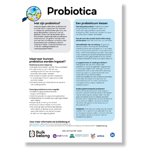 Een uitleg over wat probiotica zijn en waarvoor je ze kunt inzetten. De factsheet laat professionals zien waar ze op moeten letten op het gebied van probiotica.