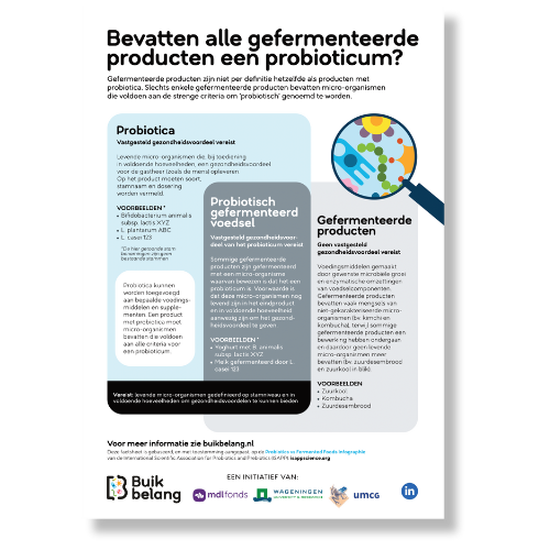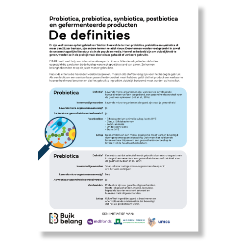 Wat zijn probiotica precies? Wat is het verschil tussen vezels en prebiotica? En hoe kies je als zorgprofessional een probioticum? Om deze en andere veelgestelde vragen helder te beantwoorden, lanceert Buikbelang zes factsheets. Ze zijn gebaseerd op de wetenschappelijk onderbouwde materialen van de International Scientific Association for Probiotics and Prebiotics (ISAPP): een internationale non-profit organisatie die wereldwijd experts samenbrengt om kennis en wetenschap over probiotica, prebiotica en gefermenteerde voeding te bevorderen.